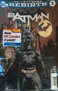 The Walmart 3-packs included both the Batman: Rebirth issue (see Episode 69 of Cool Comics) and the first issue of the ongoing Batman comic in the age of Rebirth, which is great for collectors. This first issue is packed with action, as a commercial airliner is hit with a missile as it’s flying over Gotham, and the expected crash site is filled with people. Under ordinary circumstances, you’d expect Batman to call in Superman, but Clark isn’t home, so Batman has to attempt to save the day. This is a fast-paced, hold-your-breath story that shows lots of promise for the Rebirth of DC Comics. It’s usually easy for the supernaturally powerful heroes with the ability of flight to save the day, so it makes it all the more hair-raising when someone like Batman is the only hero in town. These are the plot devices that Bruce Wayne may not like, but readers do. Pick this one up if you want to be entertained. The cover price of Batman #1 is $2.99, while the current value is $5.