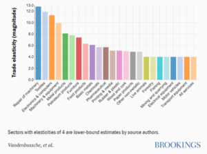 To see which industries stand to benefit most from trade economists generally look at trade elasticity, which measures the proportionate increase in demand after a reduction in trade costs allows the price of a good to decrease. Sectors with higher trade elasticities see higher demand for their products as barriers to trade are reduced. Figure 1 shows trade elasticity by sector.[3]