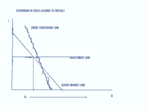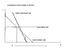 If time permitted, applying real numbers to these conditions would indicate that the interaction of these three conditions will result in a depreciating exchange rate, the sovereign’s wealth will be significantly less since the declining exchange rate has already triggered a downward-spiral, and debt would be on the rise. Figure 1 illustrates that as the exchange rate (Q) shifts to the right and continues to do so, the “Credit Constraint Line” at conflict with the “Goods Market Line” results in the sovereign’s debt rising and leading towards default.
