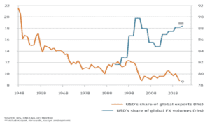 The following illustration (from JP Morgan as of April 2023) on “The Dollar’s Contrasting Fortunes” highlights the US’s share of global FX volumes increasing tremendously, and US’s share of global exports (%) decreasing equally, which implies that the value of the US $ currency decreasing and its demand, at least, as of late 2018.