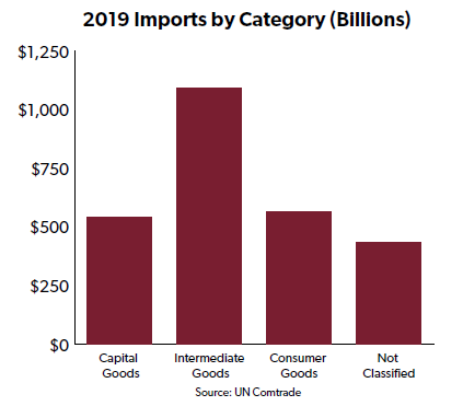 In 2019, 62.1 percent of imports were either intermediate goods like motor vehicle parts or capital goods like machinery that are used by U.S. workers to produce goods.[2] Eliminating taxes on these imports would support American manufacturing jobs, encourage companies to locate in the United States instead of abroad, and boost exports.