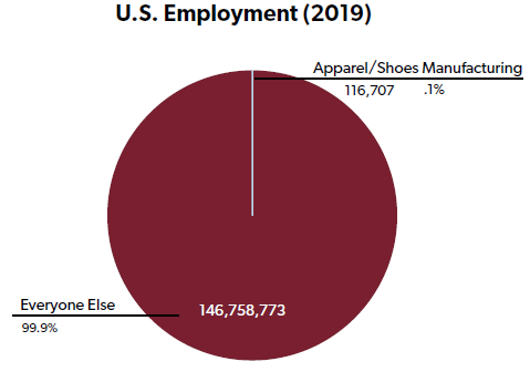 Shoe and clothing tariffs pit a small number of workers who benefit from tariffs against the vast majority of the American workforce. For every worker in the apparel and footwear manufacturing industry, 1,258 Americans working in other industries pay inflated prices for shoes and clothing as a result of double-digit import taxes.[6]