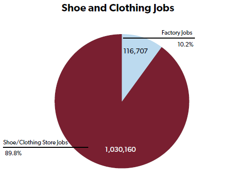 Tariffs pit workers against one another even within the shoe and clothing industry. Jobs in shoe and clothing stores outnumber jobs in shoe and clothing factories by nearly 9-to-1.[7] That doesn’t even count the millions of Americans who sell clothing and shoes at large department stores and sporting good stores.