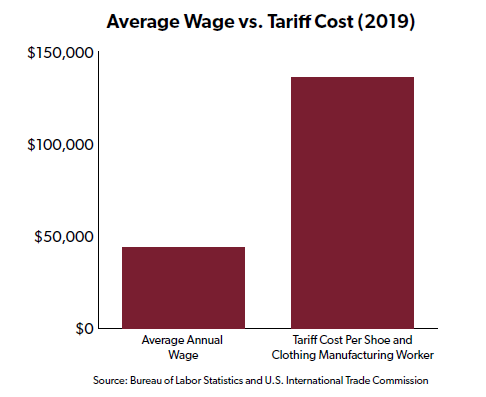 The federal government collected $15.8 billion from taxes on imported shoes and clothing in 2019, the equivalent of $135,776 for every production worker in the apparel and footwear industry. On average, apparel and footwear manufacturing workers earned less than $44,000.[8] Compared to the $15.8 billion cost of tariffs, it would cost taxpayers less to pay every person in the industry three times their current salary.