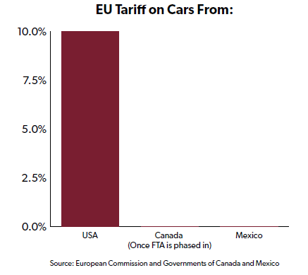 To illustrate why the failure to negotiate new trade agreements has been costly for American workers, consider the automobile industry. Cars exported from the United States to the European Union (EU) face a 10 percent tariff. But because Canada and Mexico have managed to negotiate trade agreements with the EU, cars exported from Canada and Mexico will enter tariff-free once those agreements are fully phased in.[12]