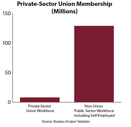 [16] Author’s calculation based on “Union affiliation of employed wage and salary workers by occupation and industry,” Bureau of Labor Statistics, accessed March 21, 2021, https://www.bls.gov/news.release/union2.t03.htm, and “Labor Force Statistics from the Current Population Survey,” Bureau of Labor Statistics, accessed March 21, 2021, https://www.bls.gov/webapps/legacy/cpsatab9.htm. Private-sector workforce includes self-employed Americans.