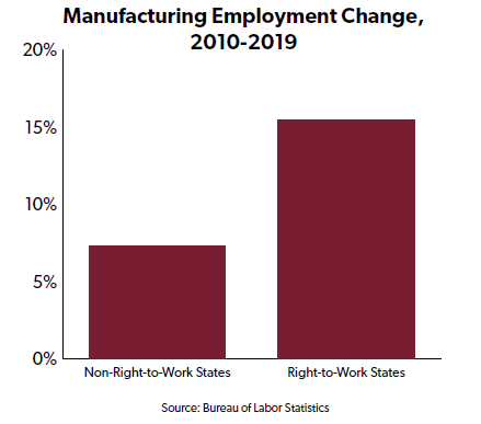 However, if labor provisions are to be included in future trade agreements, the Biden administration should consider guaranteeing every worker’s right to work without joining a labor union. Manufacturing workers in particular could benefit from this labor policy. In recent years, manufacturing employment in states with right-to-work laws has increased more than twice as much as in states that do not have such laws.[17]