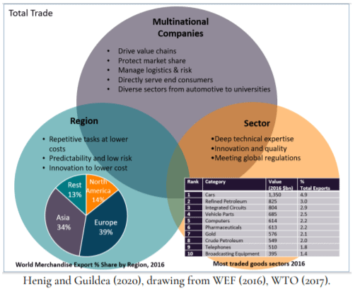 This can be illustrated as below, noting that while modern trade is particularly concentrated in three regions, Asia (mainly East, South, and Southeast), Europe, and North America, there is a diversity of traded goods and services sectors.