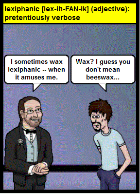 "Lexiphanic" (adjective) is a word from my book, "The Word I'm Thinking Of: A Devilish Dictionary of Difficult Words". TWITO is not a comic book; I'm just having some fun with stripcreator.com. The dialog, however, is from the book (slightly adapted).