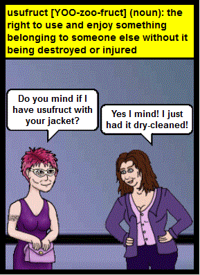 "Usufruct" (noun) is a word from my book, The Word I'm Thinking Of: A Devilish Dictionary of Difficult Words. TWITO is not a comic book; I'm just having some fun with stripcreator.com. The dialog, however, is from the book (slightly adapted).