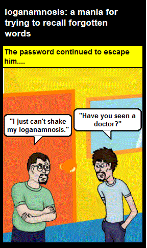 "Loganamnosis" [LAHG-an-um-NOH-sis] (noun) is a word from my book, The Word I'm Thinking Of: A Devilish Dictionary of Difficult Words. TWITO is not a comic book; I'm just having some fun with stripcreator.com. The dialog, however, is from the book.