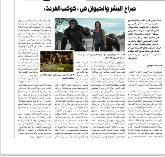 صدر الجزء الرابع من سلسلة (كوكب القردة) التي بدأت عام 2011 بفيلم ( Rise of the Planet of the Apes) وترجع هذه السلسلة إلى مجموعة من الأفلام بدأت عام 1968 حيث كان يظنّ بطل السلسلة القديمة، بأنّه بسبب عاصفة كهرومغناطيسية في الفضاء قُذف إلى كوكب تحكمه القردة، ليكتشف بأنّه على الأرض بعدما رأى رأس تمثال الحرية ملقى على أحد الشواطئ. لقد غيّرت السلسلة الجديدة الحبكة لاستكشاف آفاق أخرى للقصة، لكنّ الجوهر الدارويني مازال واضحًا، فمادام الإنسان والقرد قد انبثقا من جد مشترك، فلماذا العداء! يستكمل فيلم (Kingdom of the Planet of the Apes / مملكة القردة 2024 من إخراج ويس بال) الأجزاء الثلاثة الماضية التي تكلّمت عن ثورة سيزار وحروبه مع البشر ومحاولته أن يجعل القردة وما تبقى من البشر يعيشون في سلام. يبدأ الفيلم الجديد بمشهد لجنازة سيزار، لكنّ القردة بعد زمن طويل تنسى تعاليم سيزار أو تتناسى! حيث تظهر تجمعات قبلية للقرود، منها قبيلة النسور الذي ينتسب إليها القرد الشاب (نوا) الذي يريد أن يحتضن بيضة (النسر الأمريكي) في حزام على صدره، فإن فقست اعتبره الفرخ الصغير أمه، لكن أنسية تدعى نوفا (فريا آلان) تتسبب بكسرها. وفي مقلب آخر أصبح القرد بروكسيموس إمبراطورًا على قبائل القرود، بعدما قرأ عليه أحد البشر التاريخ الروماني، حيث كان يعتقد هذا البشري بأنّ زمن الإنسان قد انتهى وحل زمن القردة، فلماذا لا يرثون حضارة الإنسان. يحاول بروكسيموس أن يقتحم حصنًا تحت الأرض أقامه البشر لكي يحوز على معرفة وصناعة وأسلحة الإنسان، فيستعبد القرود لتكتمل خطته؛ ها هو القرد يعيد سيرة الإنسان العنفية من جديد!