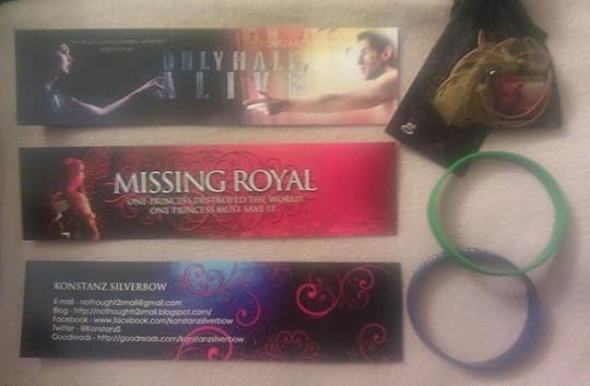 An Only Half Alive BookmarkA Missing Royal BookmarkThe Enchanted Rose Bookmark An Only Half Alive Silicone BraceletOne piece of Missing Royal Swag (Pendant or Key-chain) and a *"Protected by Dragons" Decal*Not pictured