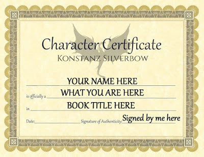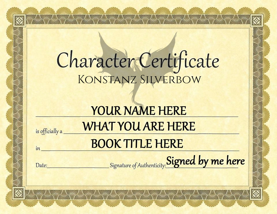 You will also receive a Character Certificate printed on 24lb gold parchment stating what book you're in, with a signature of authenticity by me.
