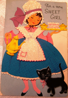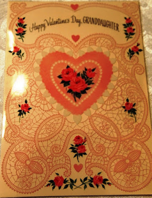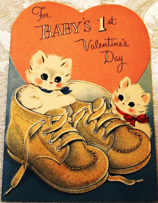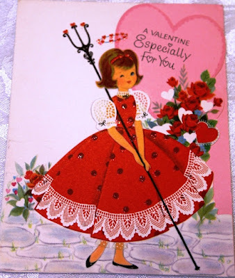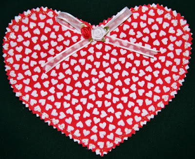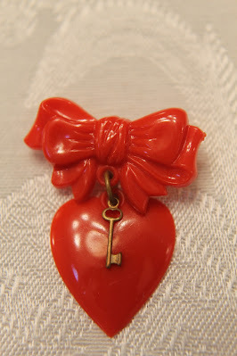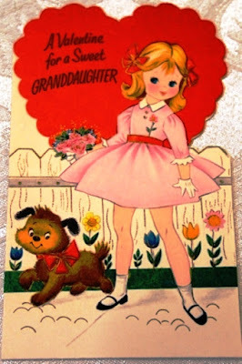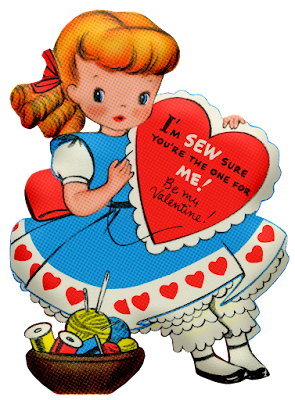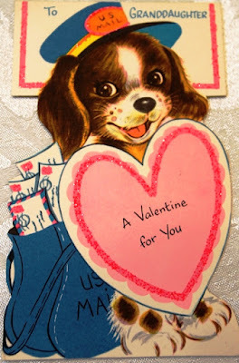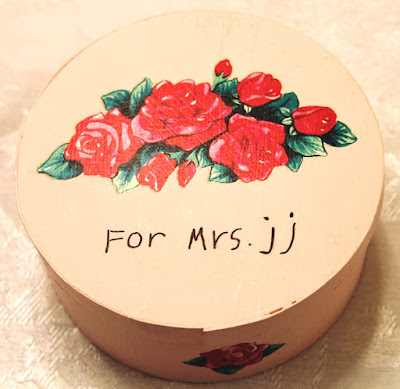 Here are photos of a few of thevintage Valentines from my collection along with a handmade fabric card I madea few years ago. The sweet red plastic heart pin was given to me when I was a childby one of my neighborhood friends. The pretty pink wooden box with theflower decal and 'For Mrs. JJ' lettering was made for me by one of my studentsback in the mid-1990s. {Each year my class called me Mrs. J.J. when they learned that my first name was June and figured out that my initials were J.J.}.