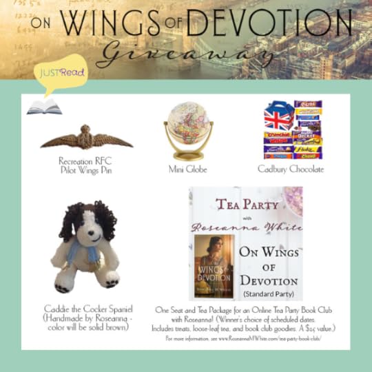 (1) winner will receive a On Wings of Devotion inspired prize pack including a Recreation RFC Pilot Wings pin, a mini globe, Cadbury Chocolate, Caddie the Cocker Spaniel (handmade by Roseanna), and One Seat and Tea Package for an Online Tea Party Book Club with Roseanna (Winner's choice of scheduled dates. Includes treats, loose-leaf tea, and book club goodies. A $25 value! For more information, visit http://www.roseannamwhite.com/tea-party-book-club/.)!