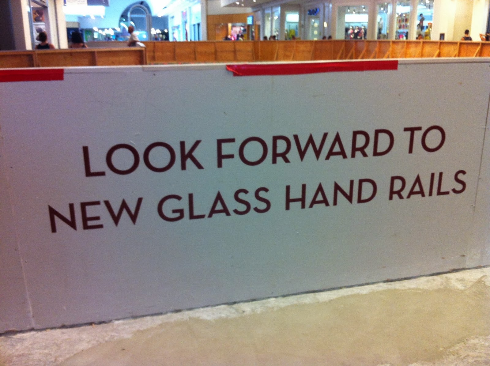 [7] A while back, I visited the Glendale Galleria during a major facelift. Stores were still operating, but floors, walls, railings and ceilings were all being replaced or renewed to better compete with the more attractive mall just across the street.Throughout this mall, large signs commanded mall visitors to look forward to the wonders that lay ahead: "Look Forward to New Glass Hand Rails," "Look Forward to Beautiful New Flooring" and "Look Forward to a Fresh Vibe."