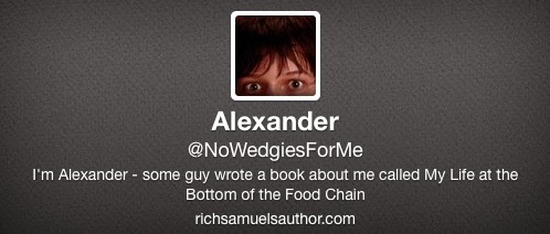 Almost a week ago, I began an experiment in, for the lack of a better term, Twitter Storytelling. I've created a Twitter account [@NoWedgiesForMe] for Alexander, the central protagonist in my novel, "My Life at the Bottom of the Food Chain." I know that there are numerous experiments going on that are along these lines, and I liked the idea of creating a supplementary "reality" for the universe by the book and it's upcoming follow-up.
