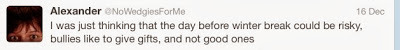 The big question - will people actually see these tweets? I don't usually search back on your earlier tweets - I'll read what you tweet now. Do I need to make Alexander a habitual repeat tweeter, so that people will actually see these? Or, do I simply use the Twitter account as a basis to create updates elsewhere (here, or on the Facebook page, for example). If a reader is more interested, then they can follow on Twitter directly. What do you think?The Story So Far: As winter vacation looms, Alexander gets nervous that bullies might plan something on the last school day before the holidays...