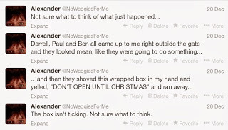 In practice, I enjoyed the creation of forty one tweets, which told a uniquely "Alexander" story, in which his wildly active imagination led him to the conclusion that he would be the victim of a horrible prank on the last day before school was out for the holidays. His panic builds until the last hours of the last day, when he's not the recipient of a horrible prank, but a mysterious wrapped gift from his supposed enemies, and a request "not to open before Christmas." With that cliffhanger, I concluded the test.