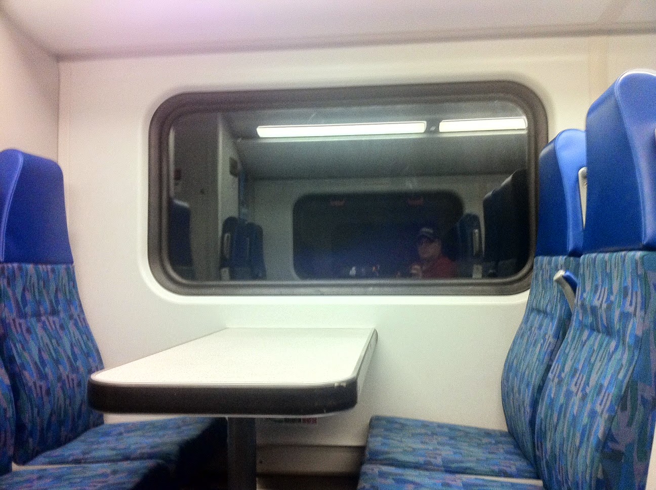 On the afternoon train, the conversation is much more energetic. People are happy to be done with their day, and some meet up with their friends and celebrate. Loudly. I've sat down at a table like the one in this blog, only to be joined by a mom and her children, and their chicken dinner. Awkward, to say the least.