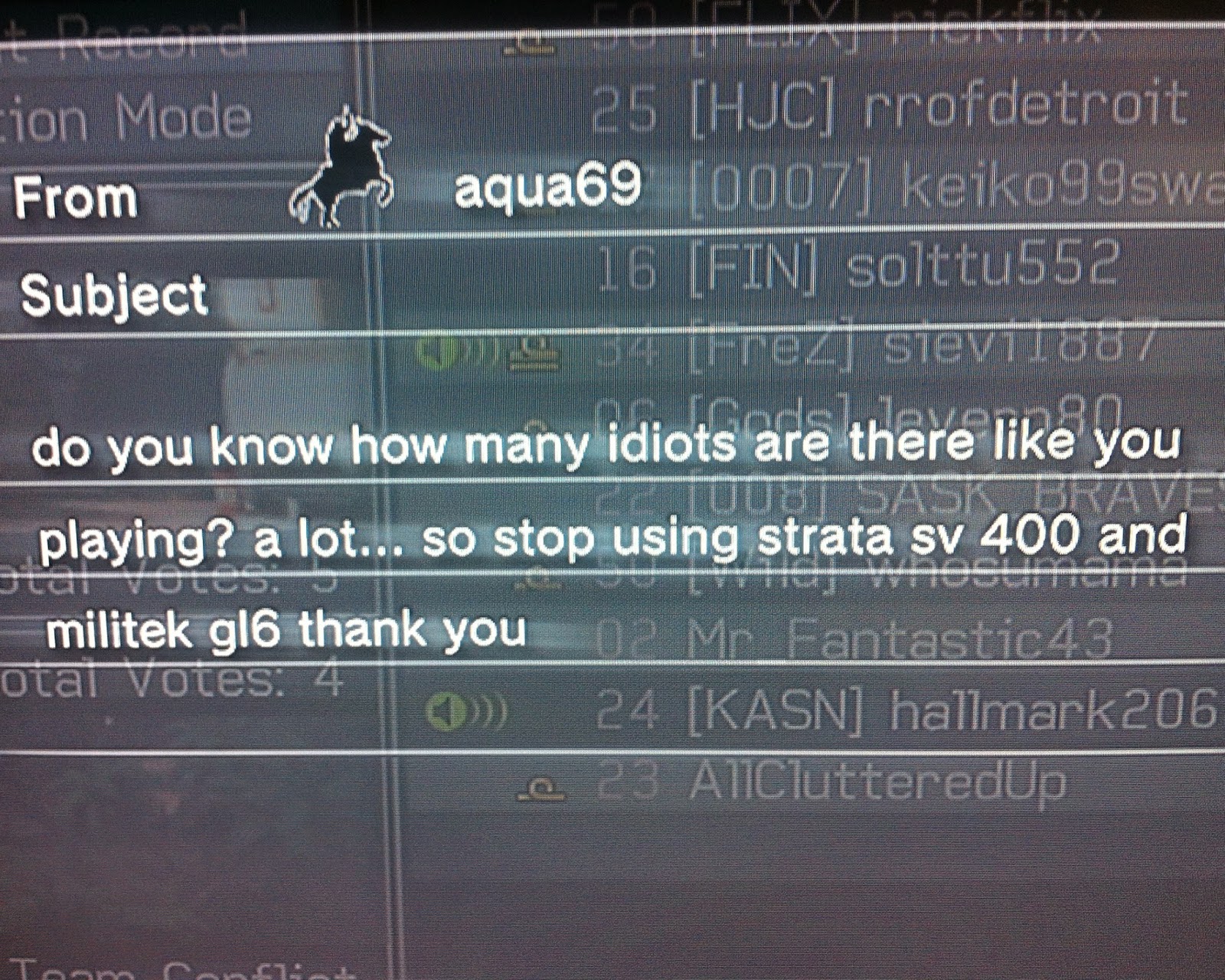 This is a last minute post (I'm a touch late, but I make the rules, so it counts!), so I think I'd share with you some of the more amusing messages I've received in what's essentially only ongoing venture into online gaming on the Playstation 3. I play just one game - James Bond Legends, and often play it in multiplayer mode, which puts me in competition with other players worldwide, either on a team or independently. For ten minutes, we shoot, are shot it, are killed and respawn to play again, all in various James Bond-related environments.