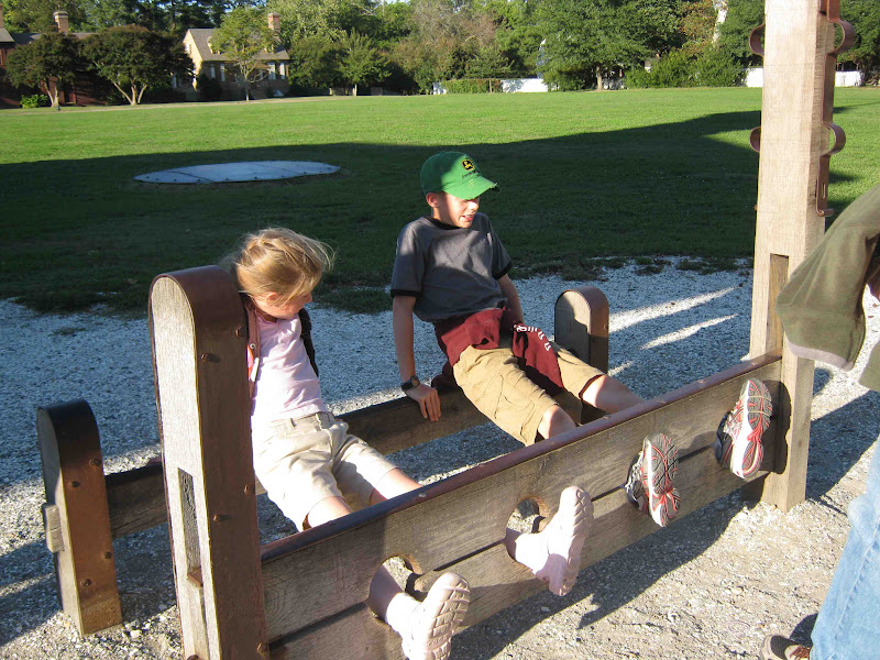 A traditional stockade.However, there is another stockade in which a prisoner's ankles were secured.In my questionable wisdom, as I wandered on my own around Colonial Williamsburg on a late afternoon, I decided to try out the ankle stockade.