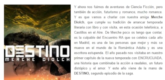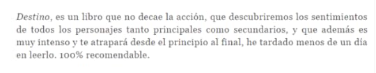 Para mis los libros es como la música. Cuando leo un libro quiero que me ponga los pelos de punta, que haga que mi corazón lata con fuerza y me haga sentir algo. Que me muera de deseos por seguir leyendo y me tenga completamente atrapada. Que nunca diga un, ya lo leeré. Me encanta engancharme sin poder soltar la novela, hasta leer mientras hago la comida o levantarme super temprano para seguir leyendo aun con los ojos pegados. Me encantan los libros que me hacen sentir, qeu me trasmite algo y sin duda alguna los libros de Merche Diolch lo hacen. Tanto este, Destino, como Encrucijada, me fascinaron.