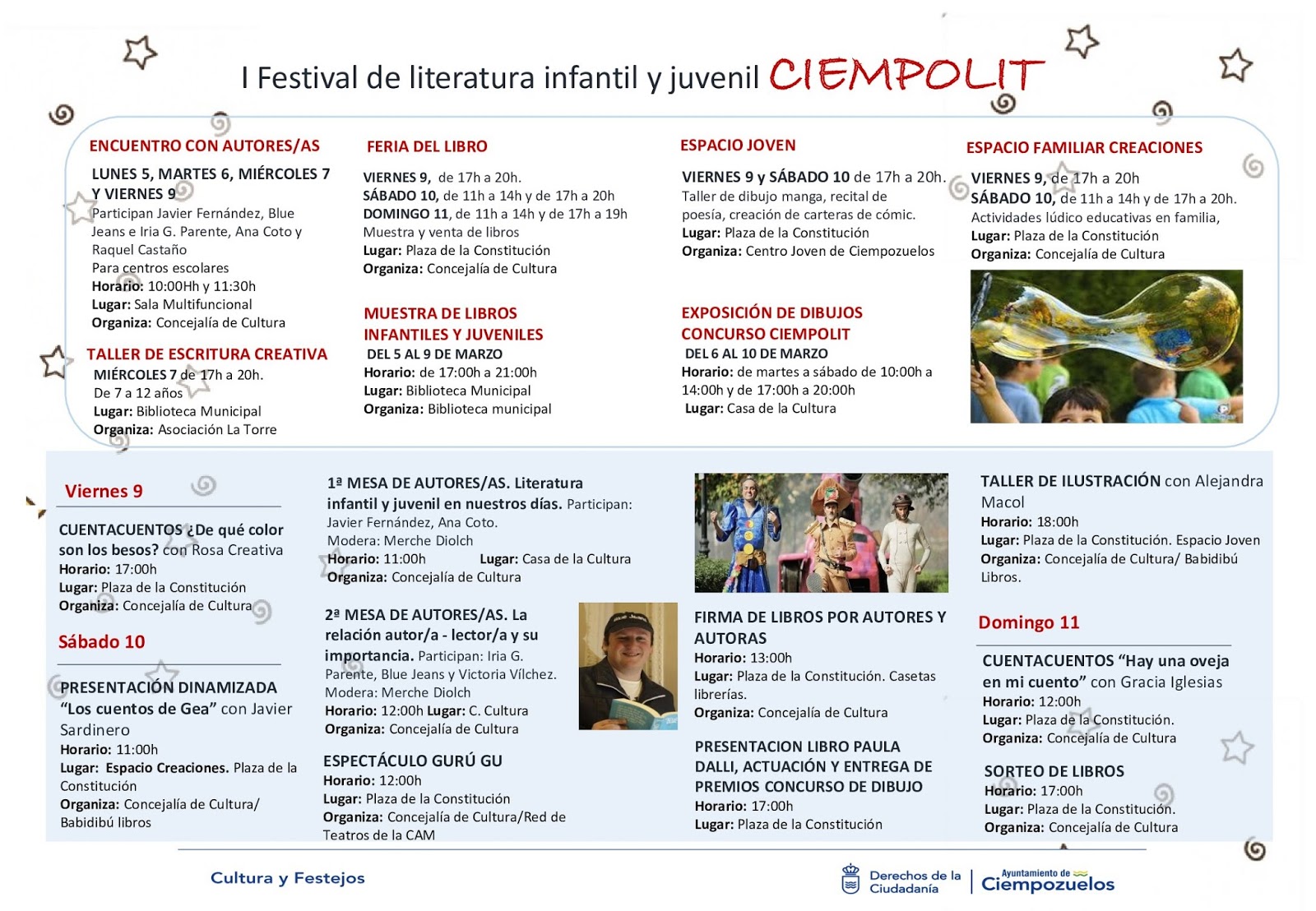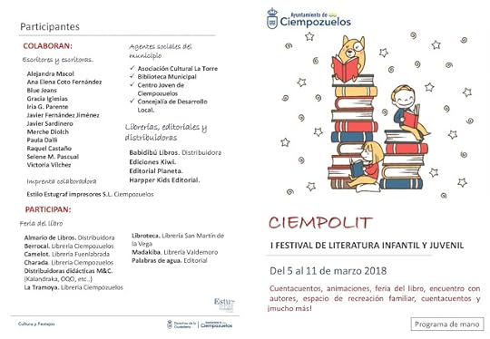 Así nació CiempoLiT, el I Festival de Literatura Infantil y Juvenil de Ciempozuelos que ofrecí ilusionada al Ayuntamiento del pueblo donde vivo y que aceptaron igual de ilusionados. Gracias a su apoyo e interés la semana que viene este pequeño municipio de la Comunidad de Madrid se verá inmerso dentro de la Literatura Infantil y Juvenil.
