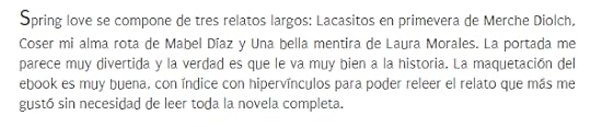 [...]A pesar de tratarse de tres relatos cortos de diferentes autoras, sus historias consiguen atrapar al lector desde el primer momento a través de una narrativa sencilla pero cargada de detalles que te hacen sentir el amor a través de las páginas.[...]
