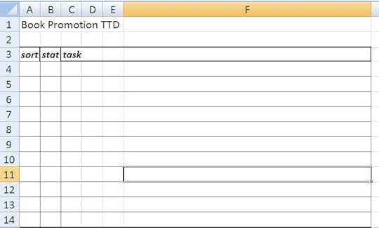 So naturally I approached the project of promoting my book like I approach all things; digitally. I first opened EXCEL and in cell A1 I typed "Book Promotion TTD". The TTD stands for Things To Do. Made it bold. Then a blank line then entered 'sort', 'stat' (for status) and 'description'. I added some formatting; reduced the width of the first 5 columns, bold/Italics/size-down for the headings and added some grid lines.