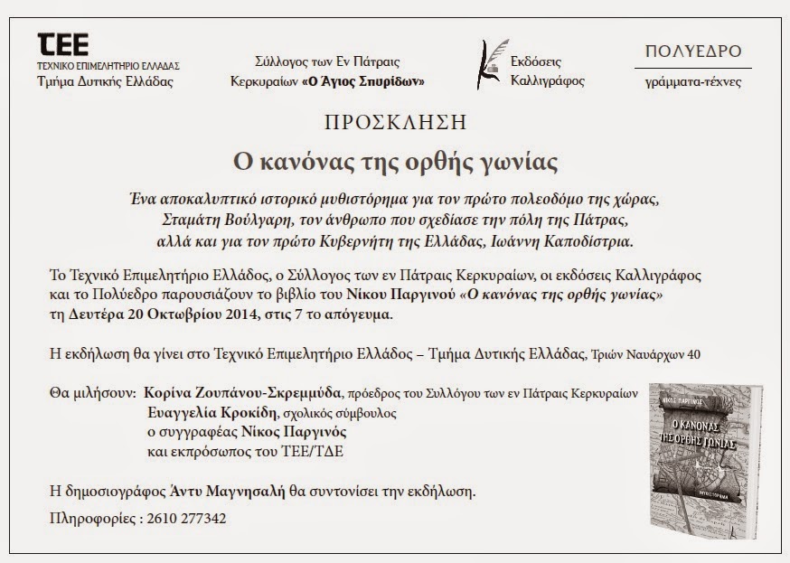 Σε μια συγκινητική εκδήλωση που διοργάνωσαν από κοινού το Τεχνικό Επιμελητήριο Τμήμα Δυτικής Ελλάδας, ο Σύλλογος των εν Πάτραις Κερκυραίων «Ο Άγιος Σπυρίδων», οι εκδόσεις «Καλλιγράφος» και το βιβλιοπωλείο «Πολύεδρο», παρουσιάστηκε στο αναγνωστικό κοινό της Πάτρας, την Δευτέρα 20 Οκτωβρίου 2014, στην αίθουσα εκδηλώσεων του Τεχνικού Επιμελητηρίου, το νέο ιστορικό μυθιστόρημα του Νίκου Παργινού: «Ο Κανόνας της ορθής γωνίας».