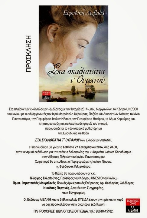Με μεγάλη χαρά και ιδιαίτερη τιμή θα πω δυο λόγια για ένα εξαιρετικό ιστορικό μυθιστόρημα μιας επτανήσιας συγγραφέως στα πλαίσια των εκδηλώσεων "Διάλογος με την Ιστορία 2014". Η παρουσίαση θα πραγματοποιηθεί σε ένα γεμάτο τριήμερο με εκδηλώσεις λόγου στη μνήμη του πρώτου κυβερνήτη της χώρας, Ιωάννη Καποδίστρια.