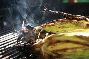 With the ribs, I’ll grill fresh corn. I soak the ears, husk and all, in water for ten minutes before trimming the silk and any loose leaves. Then I place them over the heat (gas usually, I have both gas and charcoal in my backyard). I keep them on the top rack and let the husks caramelize, turning the ears every so often. I have no idea how long it takes, I just eyeball it as I go. I try to keep the temperature around 350F for this, so expect ten or fifteen minutes for the husks to blacken, but don’t forget to turn. Soaking the corn in its own husk essentially allows it to steam when it’s cooking, resulting in sweet, tender kernels. So good!