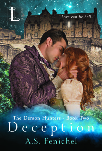 Do you like Paranormal Historical Romance? My friend A. S. Fenichel dropped by to show me the sparkly cover for her upcoming release, Deception – Book Two in The Demon Hunters series. I gave you a sneak peek on Tuesday, but here’s the full monty.