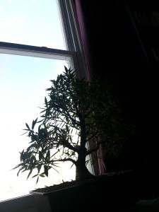 Upstairs, I have two areas for writing. One is flooded with natural light and pillows – lots of pillows, there are 5 in the photo and another 5 outside of the frame – and a view of my enormous birch tree. It’s bare right now, so all I see are my neighbours’ backyards. Thankfully, one of our bonsai trees provides a nice substitute for the birch against today’s cold, blue sky. There are also books – foreign language dictionaries, scifi, LINUX, calculus textbooks – but mostly romance.