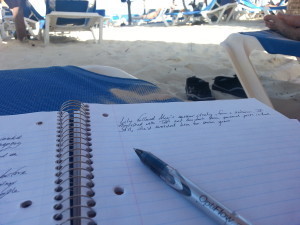 I’ve also been known to write voluminously on the beach during vacation, which is done the old-fashioned way with pen and paper. No laptops on the sand, I’m not that wealthy brave.