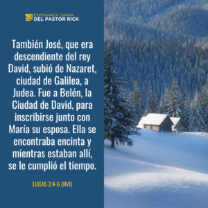 “También José, que era descendiente del rey David, subió de Nazaret, ciudad de Galilea, a Judea. Fue a Belén, la Ciudad de David, para inscribirse junto con María su esposa. Ella se encontraba encinta y mientras estaban allí, se le cumplió el tiempo”. Lucas 2:4-6 (NVI)