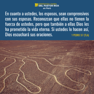 “En cuanto a ustedes, los esposos, sean comprensivos con sus esposas. Reconozcan que ellas no tienen la fuerza de ustedes, pero que también a ellas Dios les ha prometido la vida eterna. Si ustedes lo hacen así, Dios escuchará sus oraciones”. 1 Pedro 3:7 (TLA)