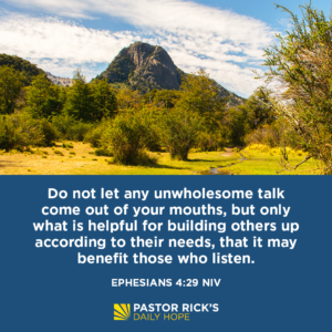 Ephesians 4:29 says, “Do not let any unwholesome talk come out of your mouths, but only what is helpful for building others up according to their needs, that it may benefit those who listen” (NIV).