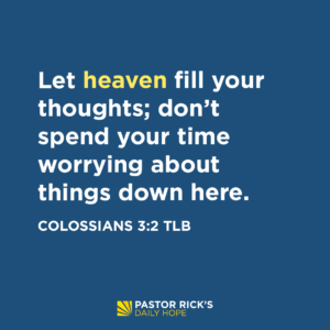 Colossians 3:2 says, “Let heaven fill your thoughts; don’t spend your time worrying about things down here” (TLB).