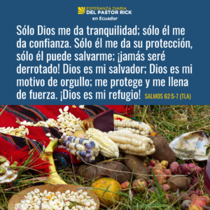 “Sólo Dios me da tranquilidad; sólo él me da confianza. Sólo él me da su protección, sólo él puede salvarme; ¡jamás seré derrotado! Dios es mi salvador; Dios es mi motivo de orgullo; me protege y me llena de fuerza. ¡Dios es mi refugio! ”. Salmos 62:5-7 (TLA)