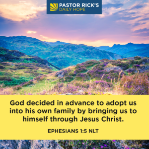 The Bible says this in Ephesians 1:5: “God decided in advance to adopt us into his own family by bringing us to himself through Jesus Christ. And this gave him great pleasure” (NLT).