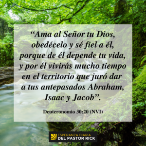 “Ama al Señor tu Dios, obedécelo y sé fiel a él, porque de él depende tu vida, y por él vivirás mucho tiempo en el territorio que juró dar a tus antepasados Abraham, Isaac y Jacob”.