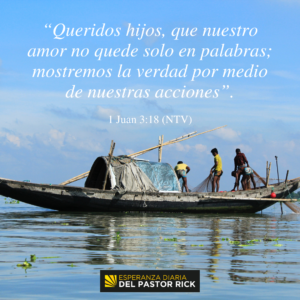 La Biblia dice: “Queridos hijos, que nuestro amor no quede solo en palabras; mostremos la verdad por medio de nuestras acciones” (1 Juan 3:18 NTV). Podemos decir: “yo amo a la gente”. ¿Pero realmente los amamos? ¿Realmente los amas? Nuestro amor se revela en cómo actuamos frente a ellos.