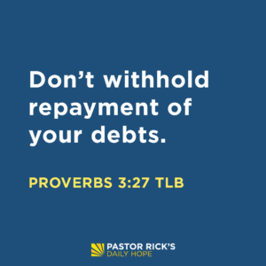 God makes it abundantly clear in the Bible how he feels about debt. Proverbs says, “Don’t withhold repayment of your debts” (Proverbs 3:27 TLB). And in Romans you can read, “Let no debt remain outstanding” (Romans 13:8 NIV).