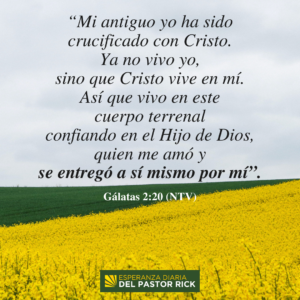 “Mi antiguo yo ha sido crucificado con Cristo. Ya no vivo yo, sino que Cristo vive en mí. Así que vivo en este cuerpo terrenal confiando en el Hijo de Dios, quien me amó y se entregó a sí mismo por mí”. Gálatas 2:20 (NTV)