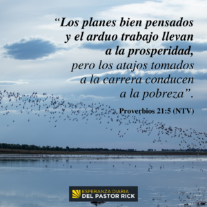 “Los planes bien pensados y el arduo trabajo llevan a la prosperidad, pero los atajos tomados a la carrera conducen a la pobreza”. Proverbios 21:5 (NTV)