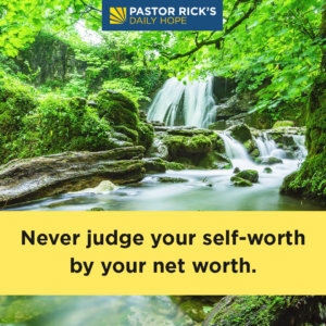 Never judge your self-worth by your net worth. Never think your value is related to your valuables. Realize that the greatest things in life aren’t things. You didn’t bring anything into the world, and you won’t take anything out of it. Life is not about acquisition or achievement; it’s about relationships and learning how to love God and other people.