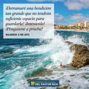 Malaquías 3:10 dice: “Traigan todos los diezmos al depósito del templo, para que haya suficiente comida en mi casa. Si lo hacen—dice el Señor de los Ejércitos Celestiales—, les abriré las ventanas de los cielos. ¡Derramaré una bendición tan grande que no tendrán suficiente espacio para guardarla! ¡Inténtenlo! ¡Pónganme a prueba!” (NTV).